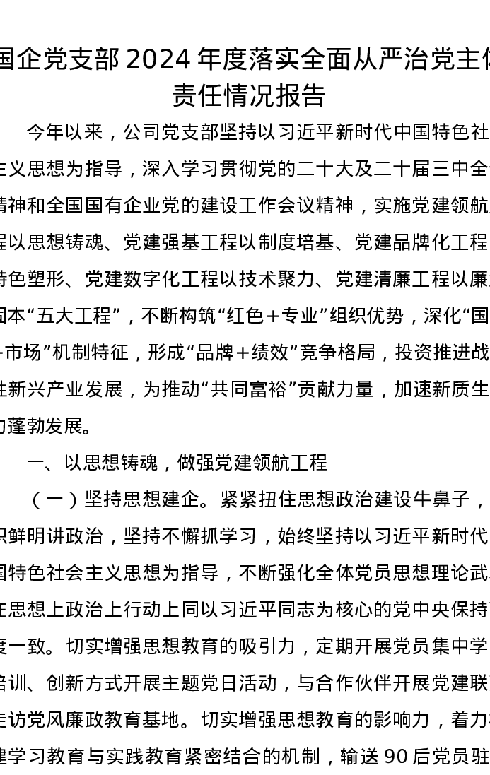 国企党支部2024年度落实全面从严治党主体责任情况报告