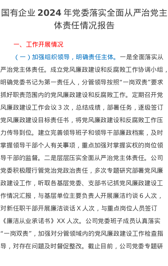 国有企业2024年党委落实全面从严治党主体责任情况报告