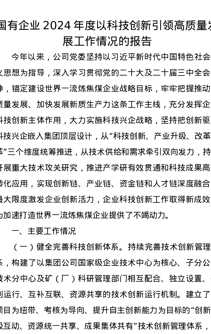 国有企业2024年度以科技创新引领高质量发展工作情况的报告
