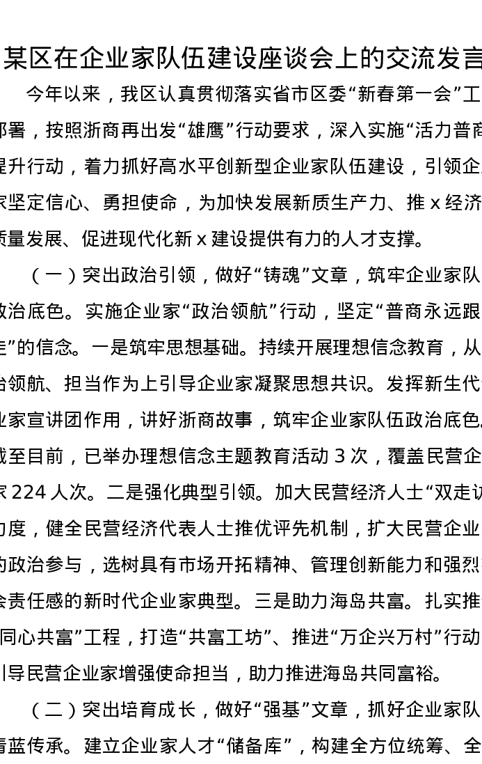某区在企业家队伍建设座谈会上的交流发言