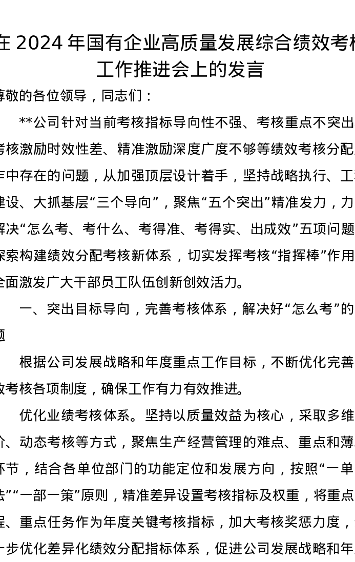在2024年国有企业高质量发展综合绩效考核工作推进会上的发言