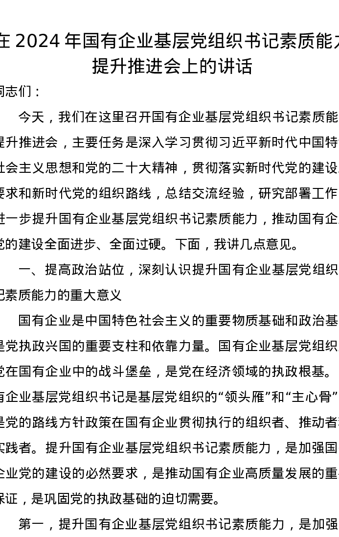 在2024年国有企业基层党组织书记素质能力提升推进会上的讲话