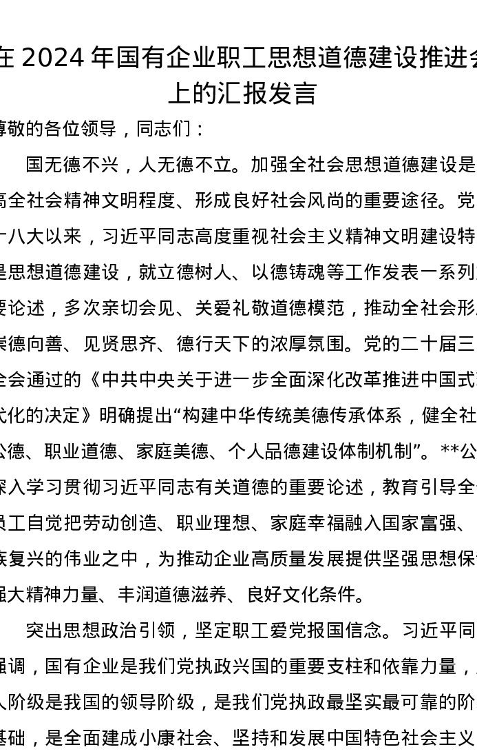 在2024年国有企业职工思想道德建设推进会上的汇报发言
