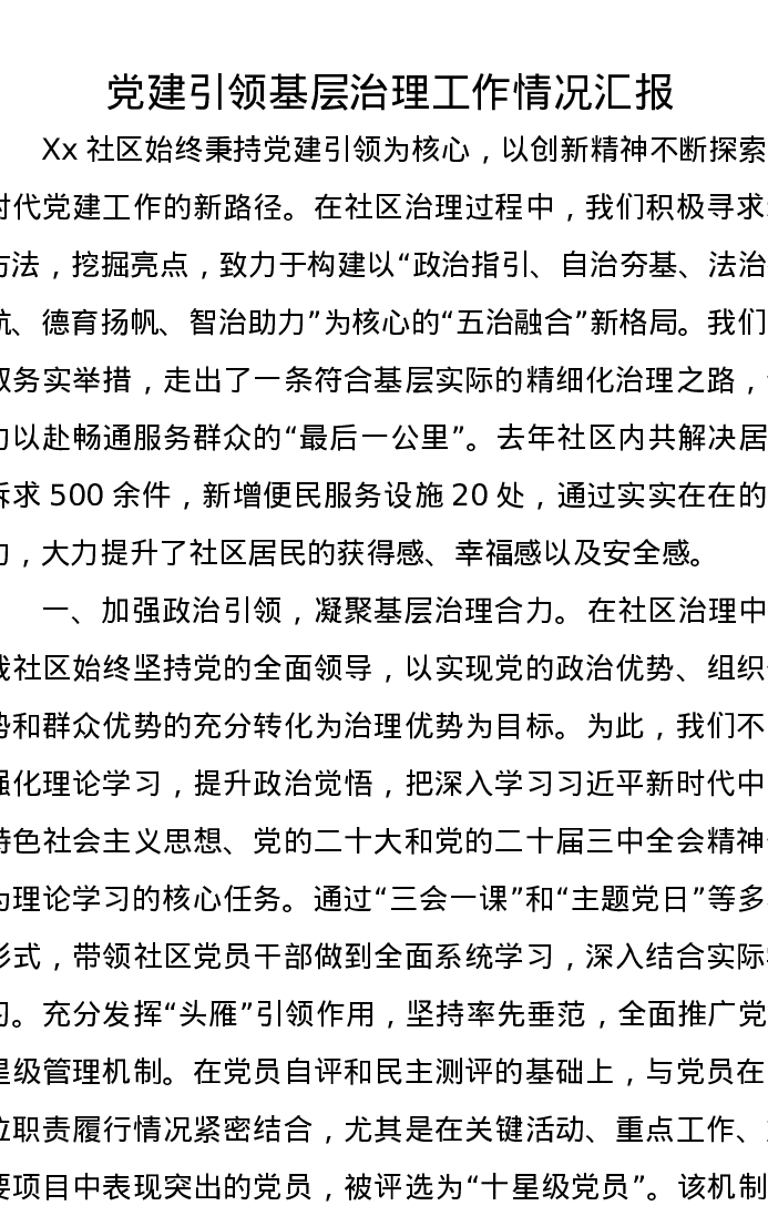 党建引领基层治理工作情况汇报
