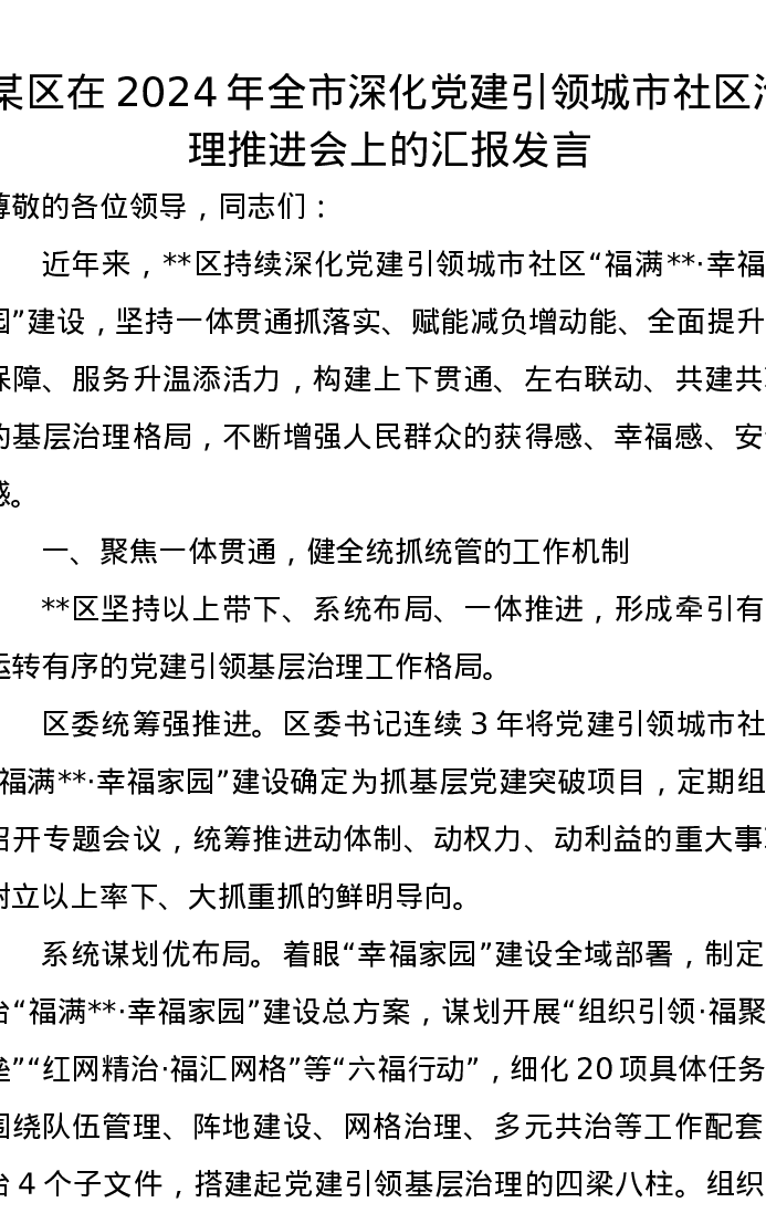 某区在2024年全市深化党建引领城市社区治理推进会上的汇报发言