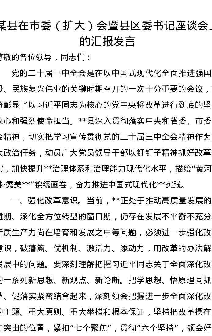 某县在市委(扩大)会暨县区委书记座谈会上的汇报发言