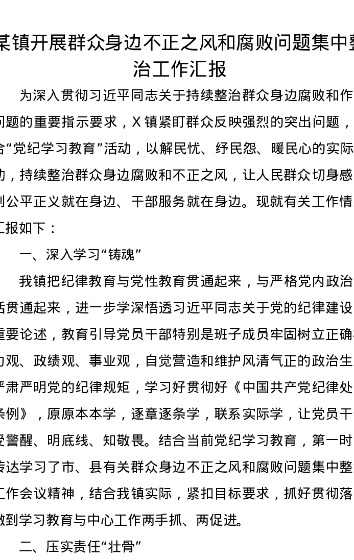 某镇开展群众身边不正之风和腐败问题集中整治工作汇报