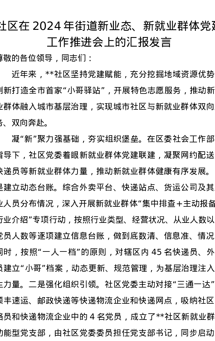 社区在2024年街道新业态、新就业群体党建工作推进会上的汇报发言