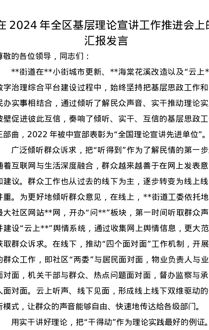 在2024年全区基层理论宣讲工作推进会上的汇报发言