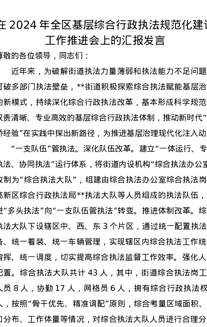 在2024年全区基层综合行政执法规范化建设工作推进会上的汇报发言