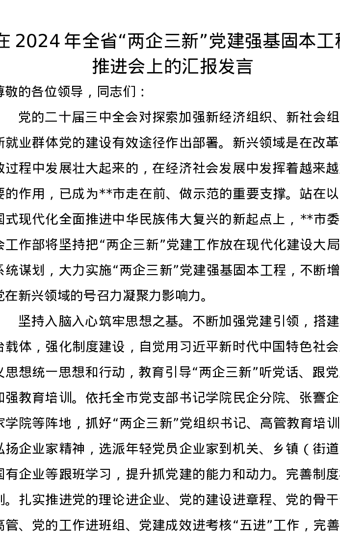 在2024年全省“两企三新”党建强基固本工程推进会上的汇报发言