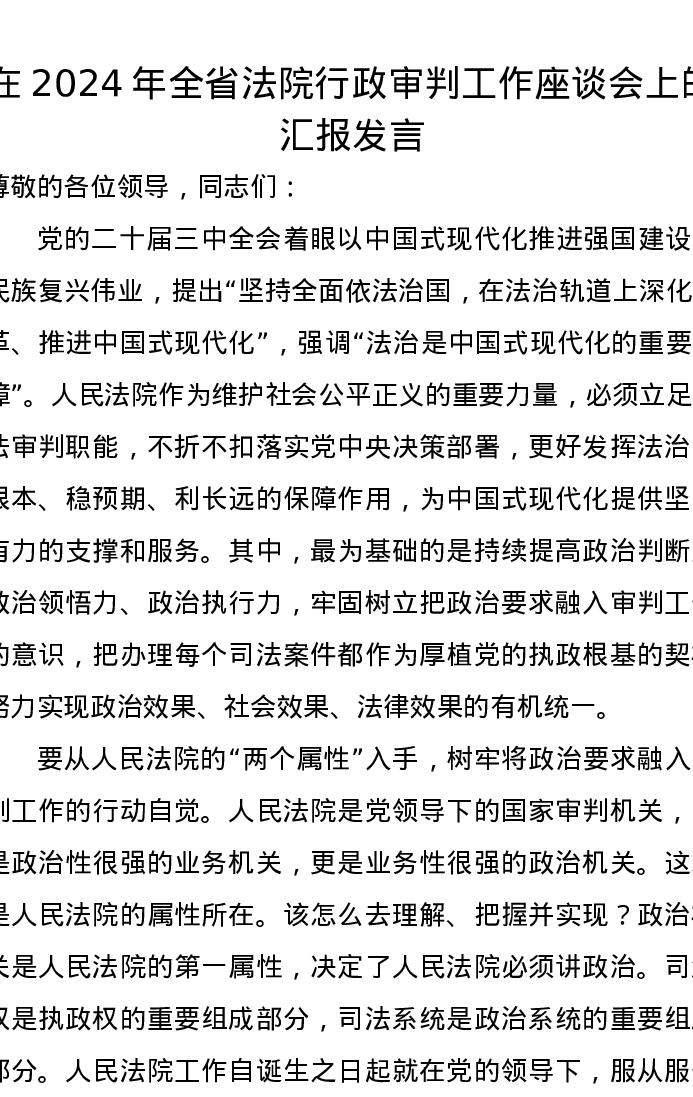 在2024年全省法院行政审判工作座谈会上的汇报发言
