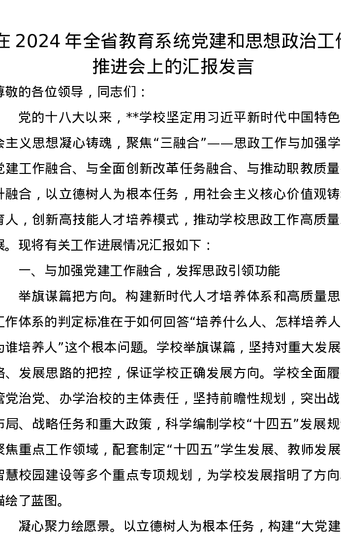 在2024年全省教育系统党建和思想政治工作推进会上的汇报发言