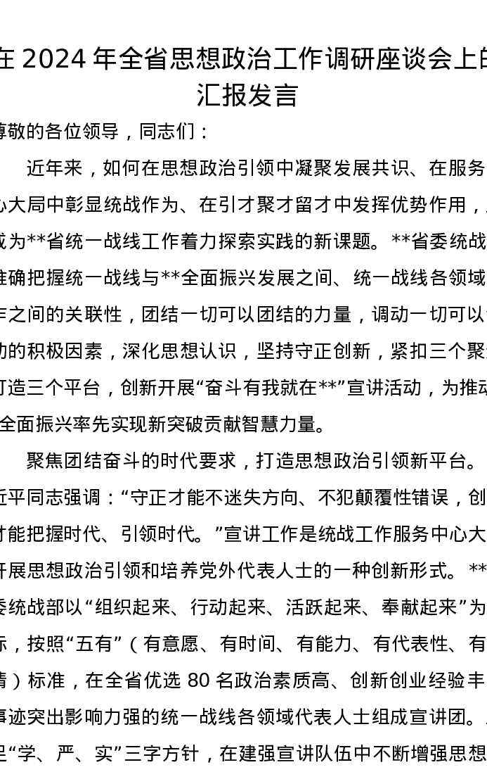 在2024年全省思想政治工作调研座谈会上的汇报发言