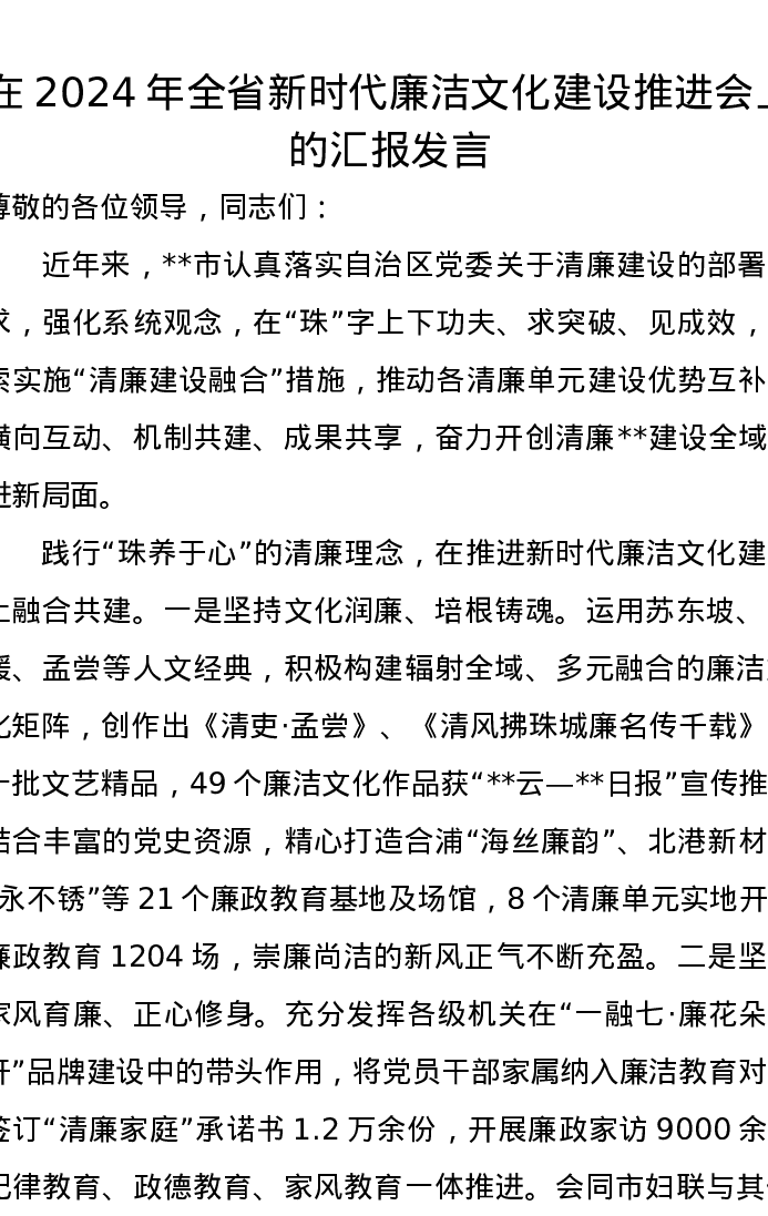 在2024年全省新时代廉洁文化建设推进会上的汇报发言