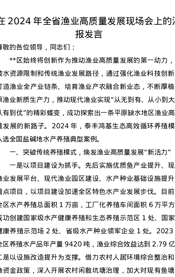 在2024年全省渔业高质量发展现场会上的汇报发言