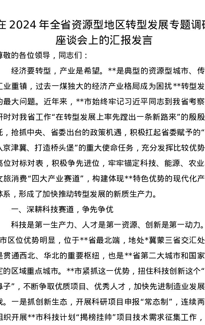 在2024年全省资源型地区转型发展专题调研座谈会上的汇报发言