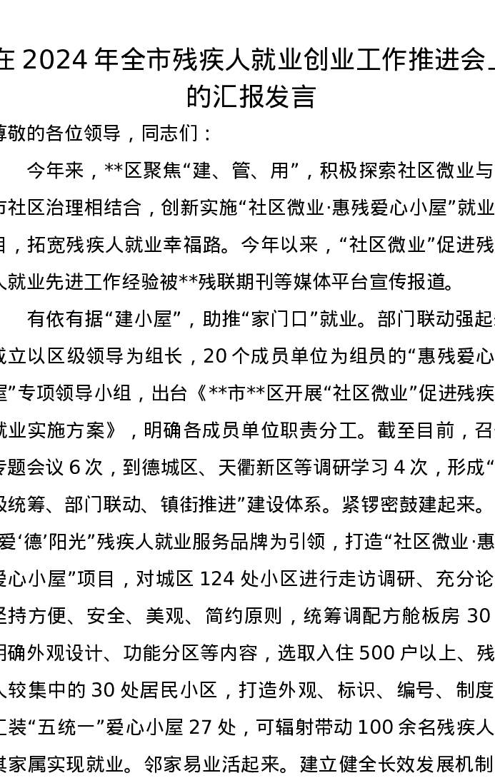 在2024年全市残疾人就业创业工作推进会上的汇报发言