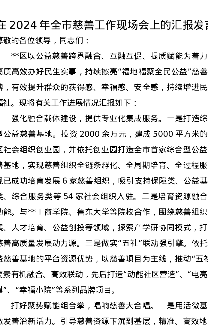 在2024年全市慈善工作现场会上的汇报发言