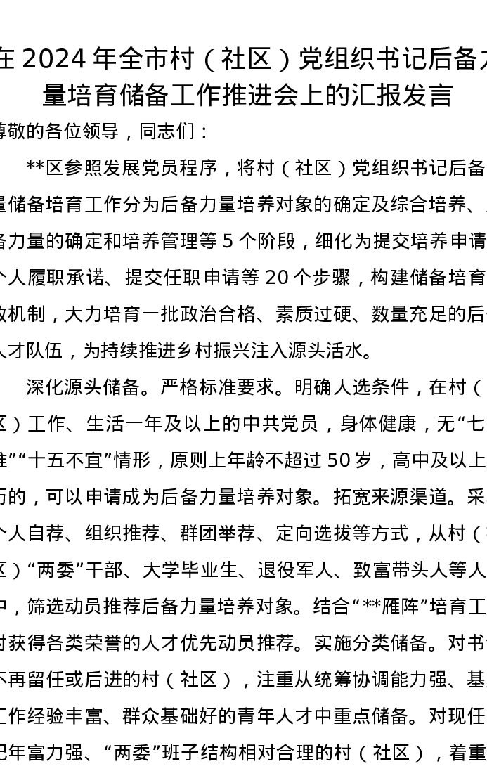 在2024年全市村(社区)党组织书记后备力量培育储备工作推进会上的汇报发言