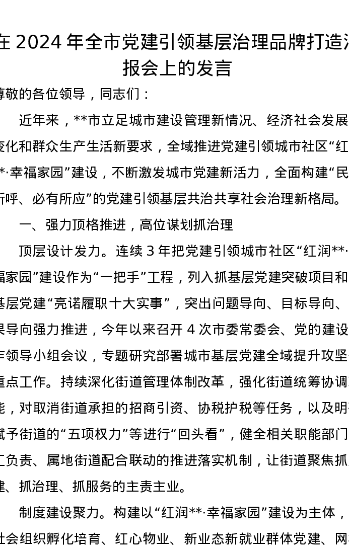 在2024年全市党建引领基层治理品牌打造汇报会上的发言