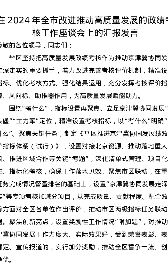 在2024年全市改进推动高质量发展的政绩考核工作座谈会上的汇报发言