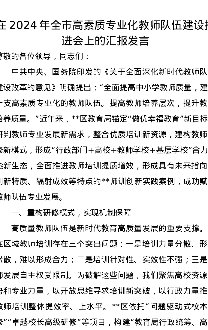 在2024年全市高素质专业化教师队伍建设推进会上的汇报发言