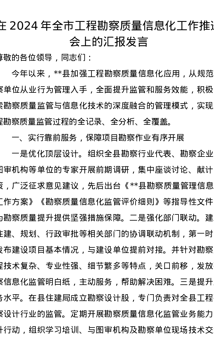 在2024年全市工程勘察质量信息化工作推进会上的汇报发言