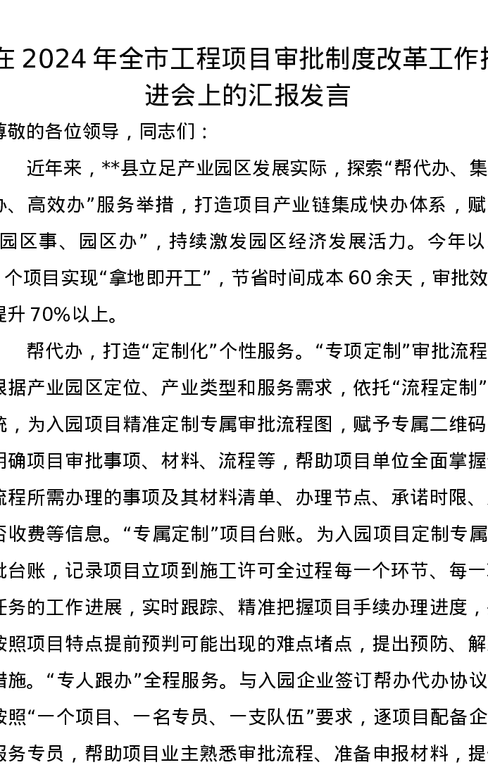 在2024年全市工程项目审批制度改革工作推进会上的汇报发言
