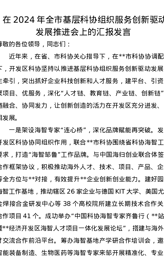 在2024年全市基层科协组织服务创新驱动发展推进会上的汇报发言