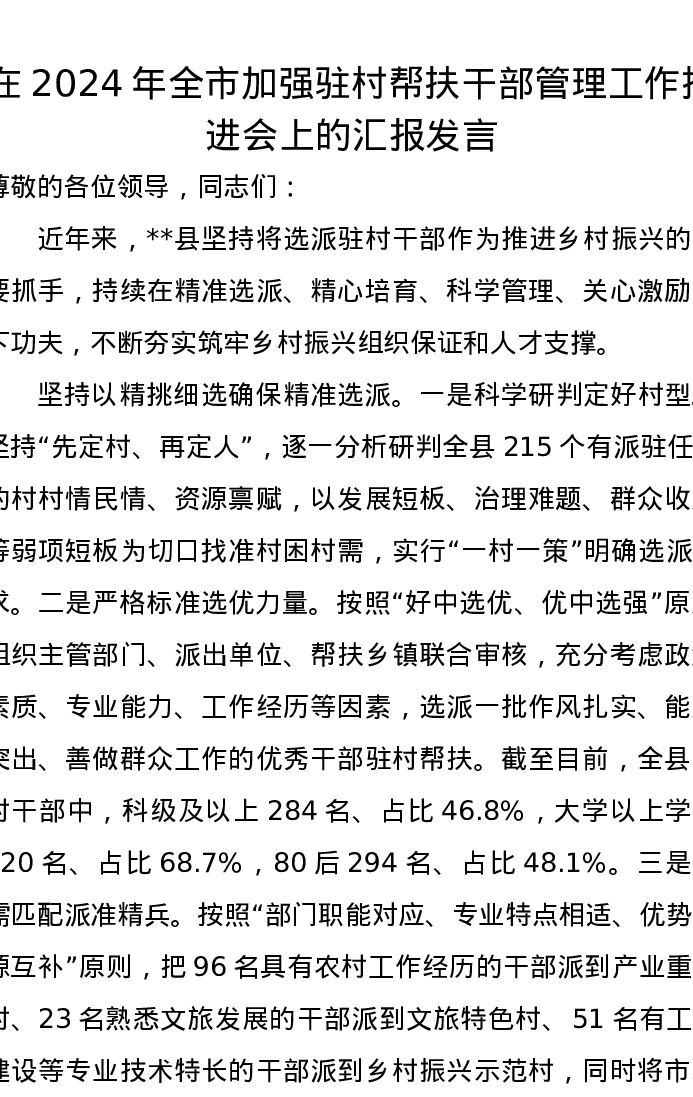 在2024年全市加强驻村帮扶干部管理工作推进会上的汇报发言