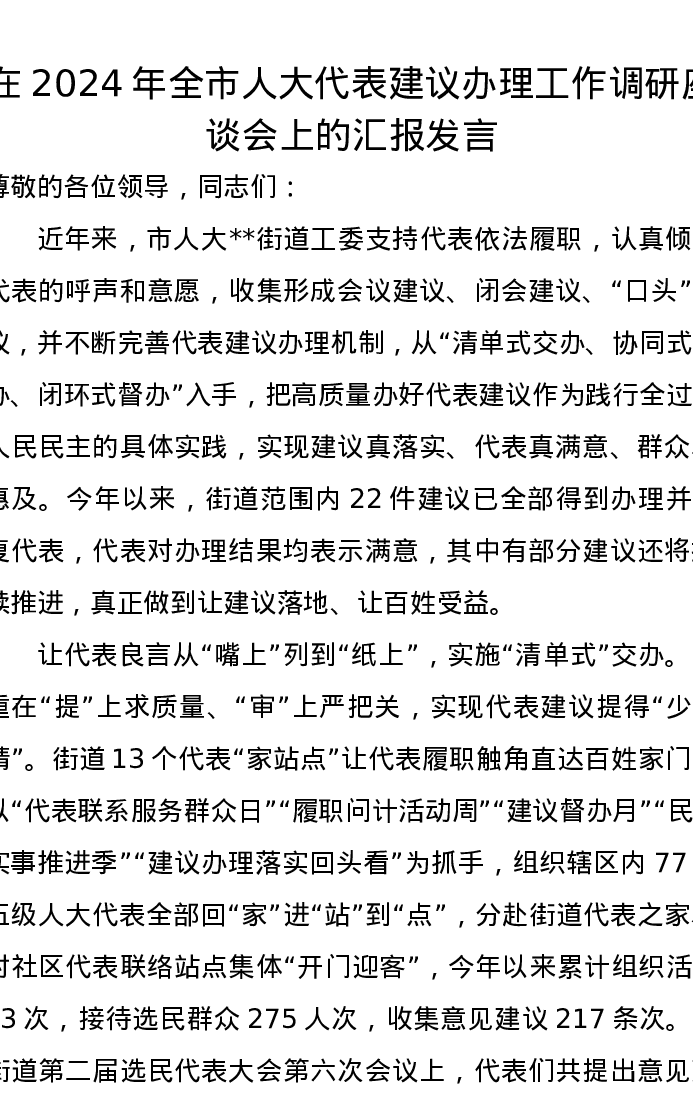 在2024年全市人大代表建议办理工作调研座谈会上的汇报发言