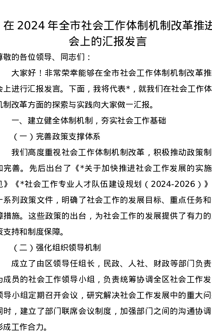 在2024年全市社会工作体制机制改革推进会上的汇报发言