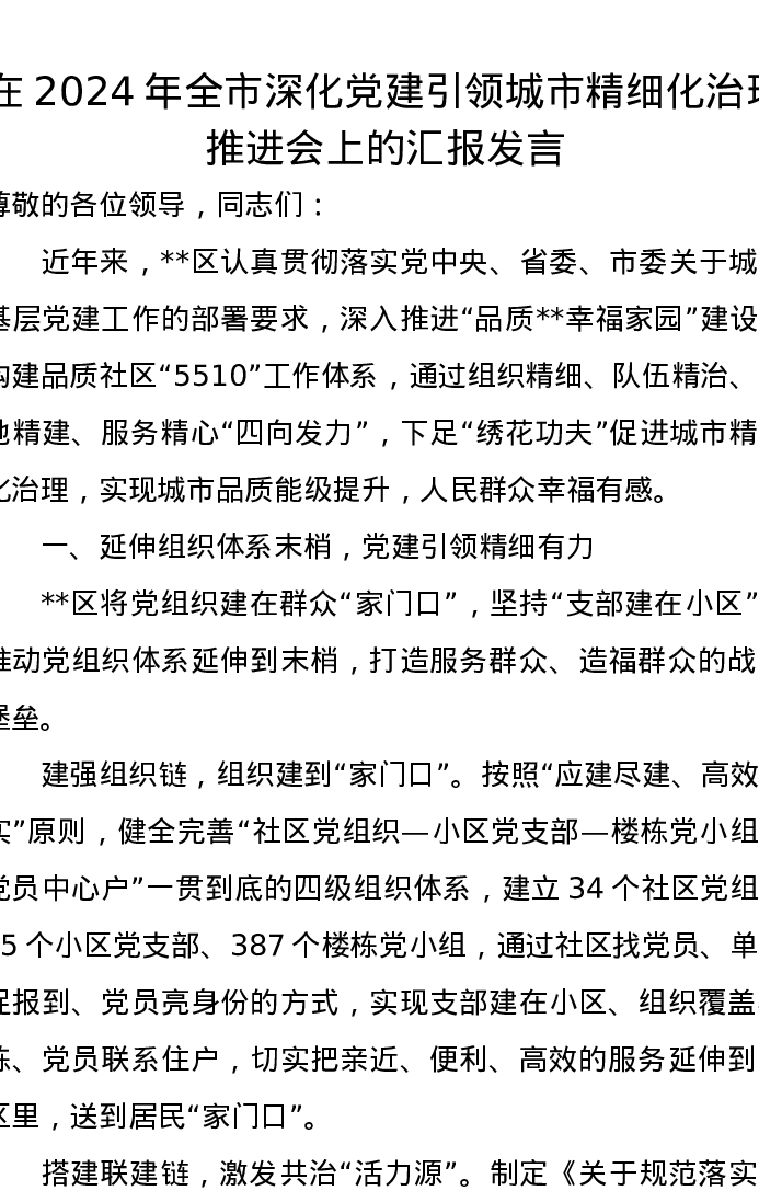 在2024年全市深化党建引领城市精细化治理推进会上的汇报发言