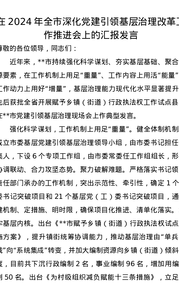 在2024年全市深化党建引领基层治理改革工作推进会上的汇报发言