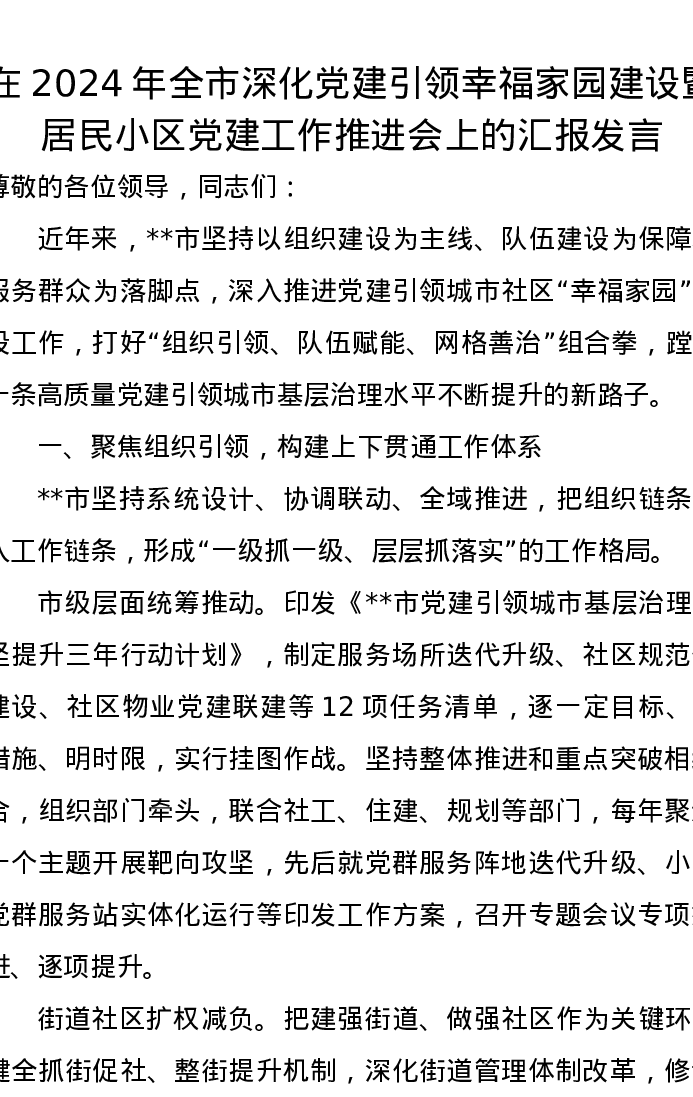在2024年全市深化党建引领幸福家园建设暨居民小区党建工作推进会上的汇报发言