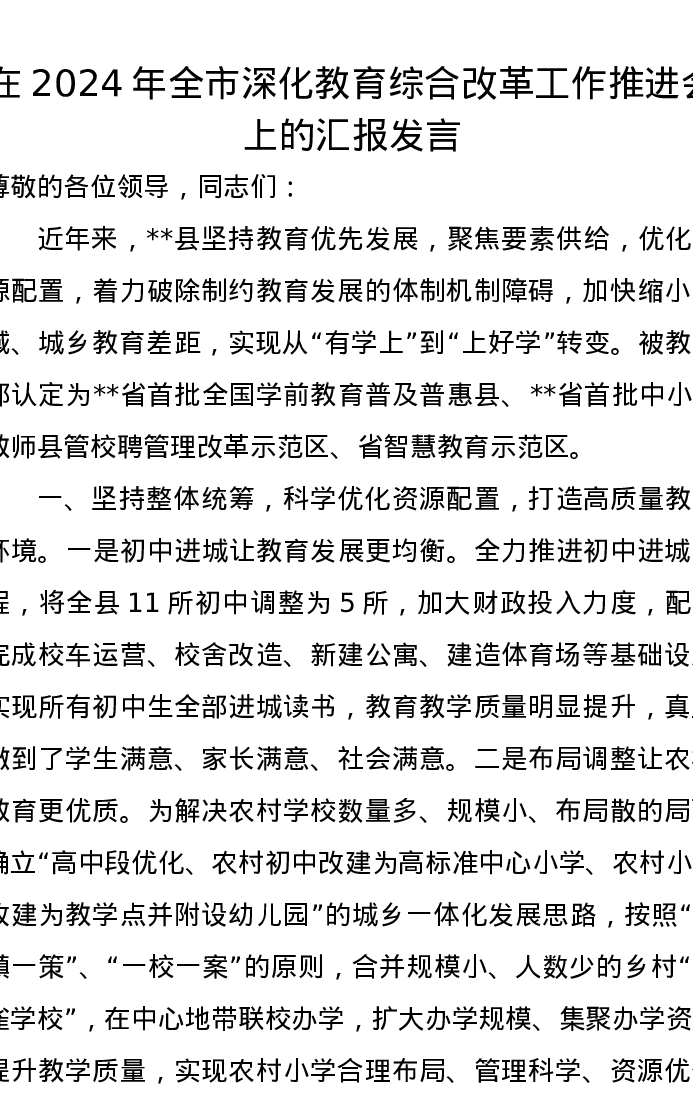 在2024年全市深化教育综合改革工作推进会上的汇报发言