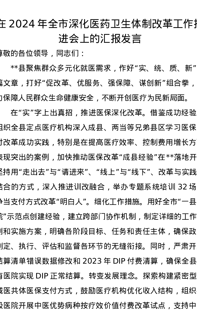 在2024年全市深化医药卫生体制改革工作推进会上的汇报发言