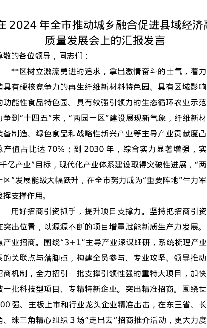 在2024年全市推动城乡融合促进县域经济高质量发展会上的汇报发言