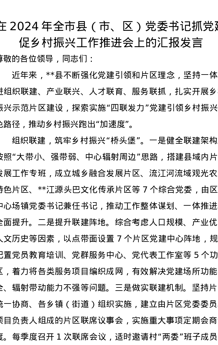 在2024年全市县(市、区)党委书记抓党建促乡村振兴工作推进会上的汇报发言