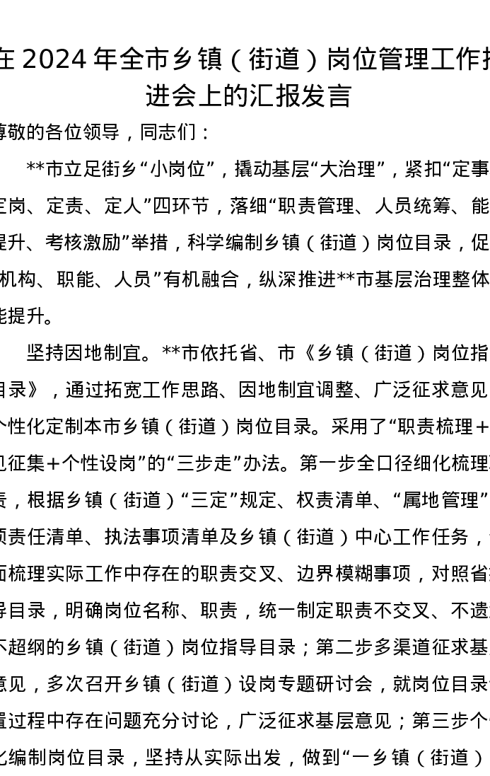 在2024年全市乡镇(街道)岗位管理工作推进会上的汇报发言