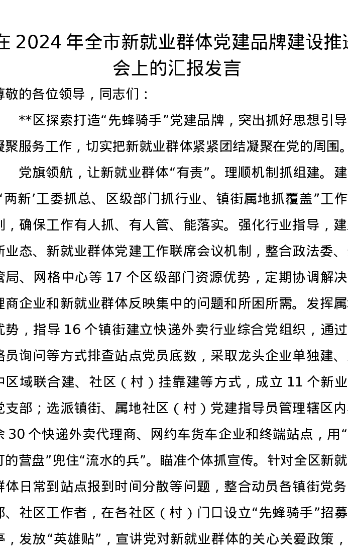 在2024年全市新就业群体党建品牌建设推进会上的汇报发言