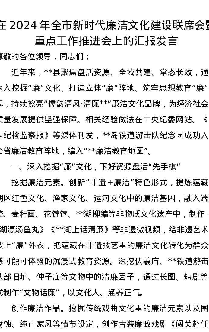 在2024年全市新时代廉洁文化建设联席会暨重点工作推进会上的汇报发言
