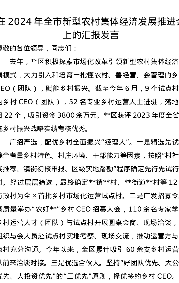 在2024年全市新型农村集体经济发展推进会上的汇报发言