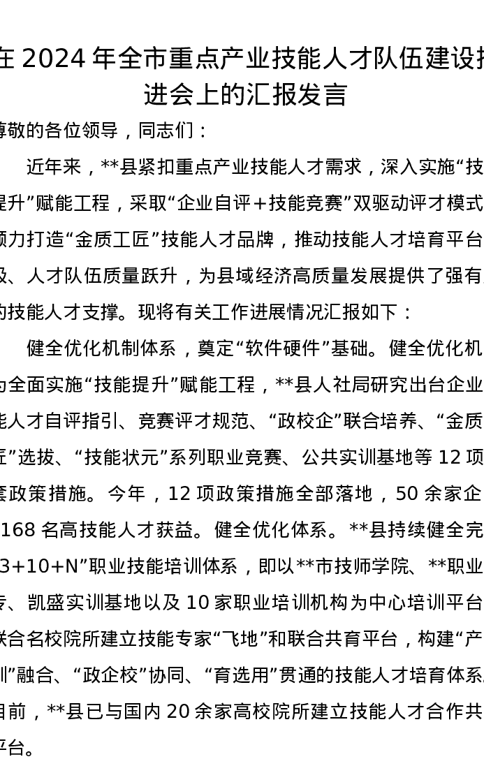 在2024年全市重点产业技能人才队伍建设推进会上的汇报发言
