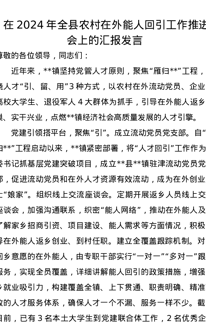 在2024年全县农村在外能人回引工作推进会上的汇报发言