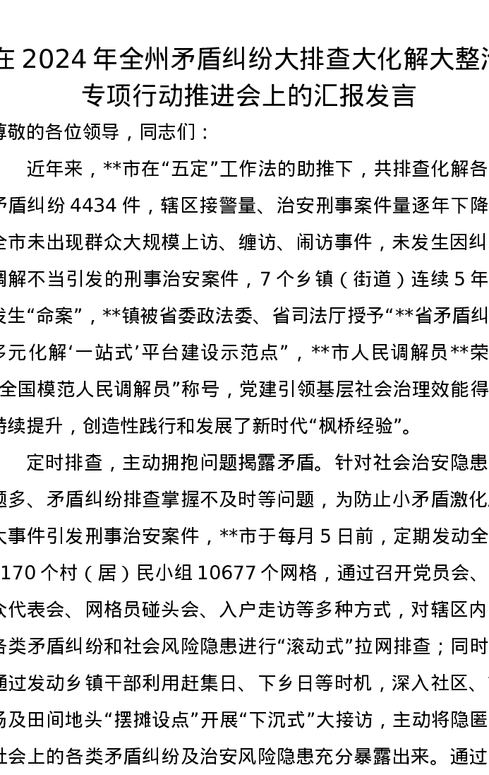 在2024年全州矛盾纠纷大排查大化解大整治专项行动推进会上的汇报发言