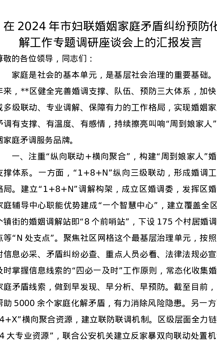 在2024年市妇联婚姻家庭矛盾纠纷预防化解工作专题调研座谈会上的汇报发言