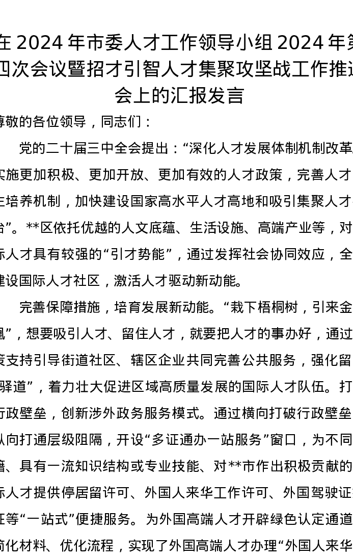 在2024年市委人才工作领导小组2024年第四次会议暨招才引智人才集聚攻坚战工作推进会上的汇报发言