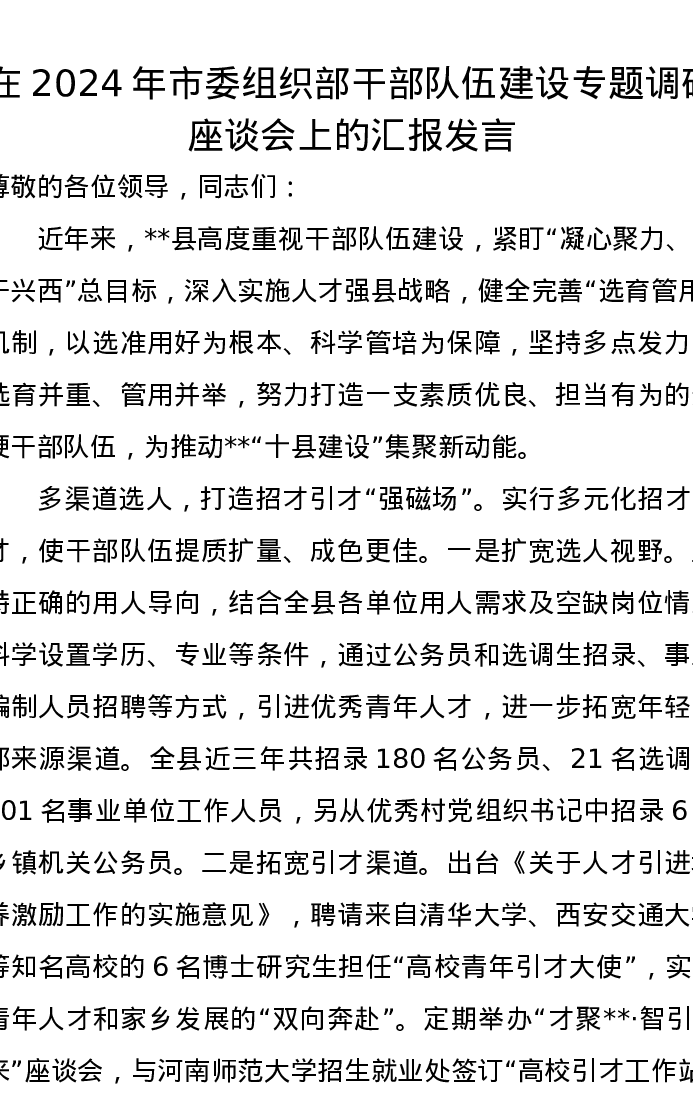 在2024年市委组织部干部队伍建设专题调研座谈会上的汇报发言